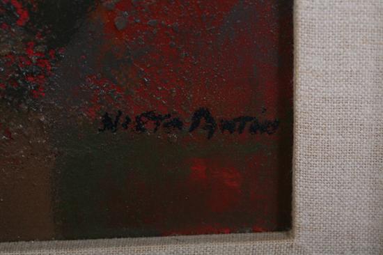 TEODORO NIETO ANTON (Spanish, b. 1944). TERNURA EN LA NOCHE GOTICA, signed lower right. Mixed media on panel - Framed, sight: 23 1/2 in. x 12 1/2 in.