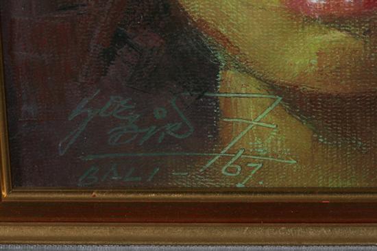 JOE DIR (Indonesian, 20th century). BALINESE GIRL, signed, dated '67 and located Bali lower left. Oil on canvas - Framed, 12 in. x 8 in. Estimate $200-300