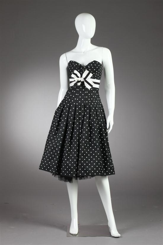 Sale 78 Lot 95 TWO VICTOR COSTA PARTY DRESSES. 1980s. Including knee-length gold lamé, with ruched bodice and drop-waist, size 8, retailed I.Magnin; and strapless knee-length black and white polka dot, with ribbon and bow at waist, size 10. Each with tulle underskirt Estimate $75-100 NOTE: Sale benefiting Shepherd's Table, Silver Spring, Md The gold lamé in excellent condition - without holes, stains or odors. The polka dot with minor wear along edge under the arms; otherwise in excellent condition. Sold for $30
