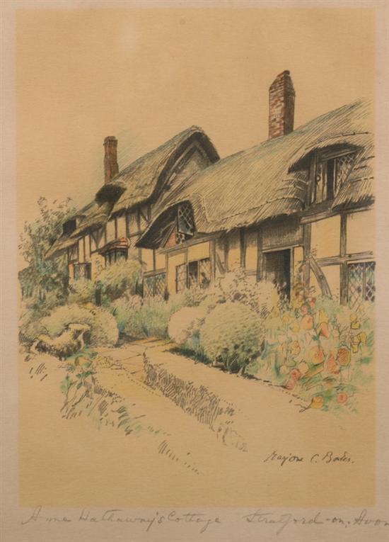 MARJORIE BATES (English, 19th/20th century), ANNE HATHAWAY'S COTTAGE, STRATFORD-UPON-AVON, titled in pencil lower margin. Print - Framed, image: 7 in. x 5 in.