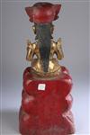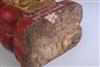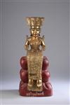 BURMESE GILT AND LACQUERED WOODEN FIGURE OF NAT, Early 20th Century. Seated on red lacquered triple-plinth, wearing animal-head headdress - 20 in. high.