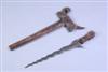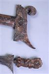 INDONESIAN DAGGER (KRIS). Old Damascus blade is inlaid with streaks of silver. Scabbard and handle of carved wood appear to be of later vintage than the blade. - blade: 16 1/4in / 41 3/10 cm. Estimate $150-300