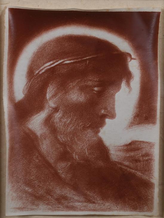 Sale 44 Lot 619 AMERICAN SCHOOL (19th century). PROFILE OF CHRIST, conte drawing on paper. Inscribed on reverse, "My soul is sorrowful..." - Framed,21 3/4 in. x 19 in. . Estimate $100-200 Unsold