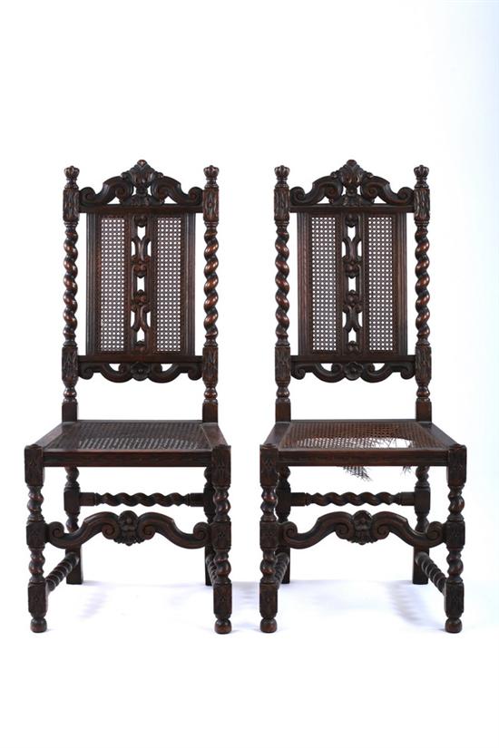 PAIR WILLIAM AND MARY STYLE OAK SIDE CHAIRS,19th century. Carved scrolling foliate crest centering turned crown-form finials; barley-twist stiles, double cane-panel back, and cane seat; on block and spiral turned legs joined with similar stretchers - 43 1/2 in. x 19 1/2 in. x 16 1/2 in. Estimate $300-500