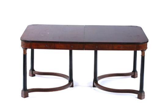 NEOCLASSICAL STYLE MAHOGANY DINING TABLE. 20th century. Rounded corners over star-enhanced frieze; ebonized columnar legs, with shaped stretcher - 30 1/2 in. x 64 in. x 42 in. Estimate $300-500 PROVENANCE: Estate of Suzanne S. Holcomb, Washington, DC