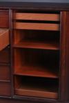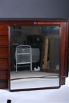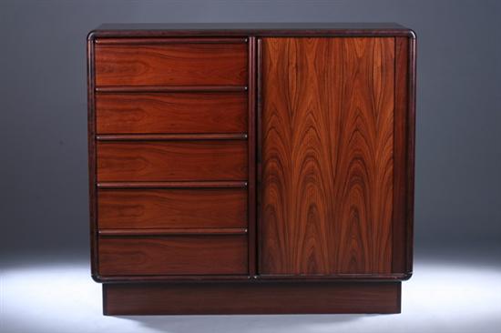 DANISH MODERN ROSEWOOD CHEST OF DRAWERS, 20th century, with tamboured door and mirror. Five-drawer facade with sliding door opening to additional shallow drawers and shelves; on plinth base - Case: 46 in. x 51 in. x 19 in. Mirror: 43 in. x 35 1/2 in.