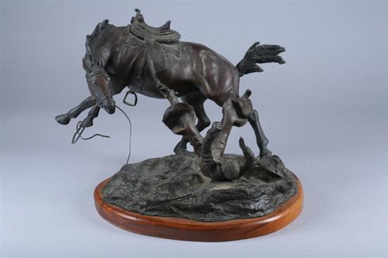 HJ RAVANDI (20th century). MAN FALLING OFF HORSE, signed and dated 1984 on base. Bronze C - height: 13 1/2 in.