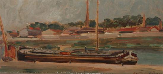 CANADIAN SCHOOL (19th/20th century). CANAL BARGE AT DOCK, Noted indistinctly "Christmas - Montreal" (?) Oil on board C - Framed, 8 in. x 17 1/4 in. Estimate $200-400