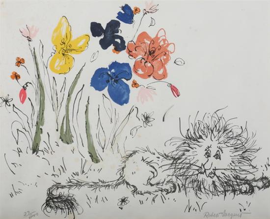 ROBERT VARGEUT (American, 20th century). LION AND FLOWERS, signed in pencil lower right, numbered 27/200 lower right. Color lithograph - Framed, sight: 16 3/4 in. x 20 3/4 in. Estimate $75-100