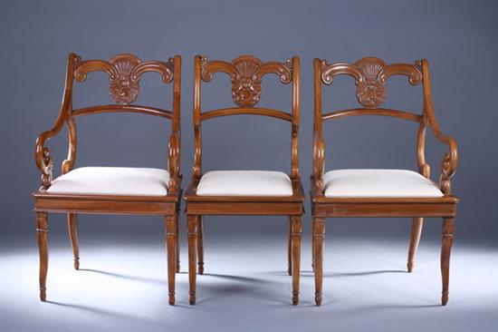 SET TWELVE ANGLO-INDIAN REGENCY-STYLE DINING CHAIRS.20th century, with walnut finish. With muslin covered slip-seats and carved upper splats, above curved stay-rail; box-framed seat; on shaped tapering saber legs - 37 in. x 19 x 19 in. Estimate $500-800