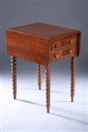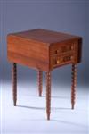 AMERICAN TWO-DRAWER, DROP-LEAF SIDE TABLE, 19th century. Stacking drawer case with quarter-round bobbin-turned molding; figured veneer panels; turned wooden knobs; on spool-turned legs - 29 in. x 22 1/4 in. x 16 1/4 in. Estimate $250-350