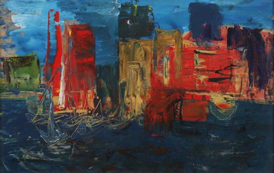AMERICAN SCHOOL (20th century). ABSTRACT HARBOR SCENE, signed illegibly lower left. Oil on board - Framed, 11 in. x 17 in. Estimate $100-150