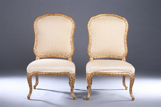 PAIR ROCOCO STYLE GILT SLIPPER CHAIRS, early 20th century, with cream colored floral upholstery. Cartouche back; stuff-over seat; cabriole legs - 38 in. x 22 in. x 19 in. Estimate $250-350