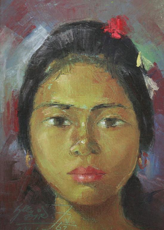 JOE DIR (Indonesian, 20th century). BALINESE GIRL, signed, dated '67 and located Bali lower left. Oil on canvas - Framed, 12 in. x 8 in. Estimate $200-300