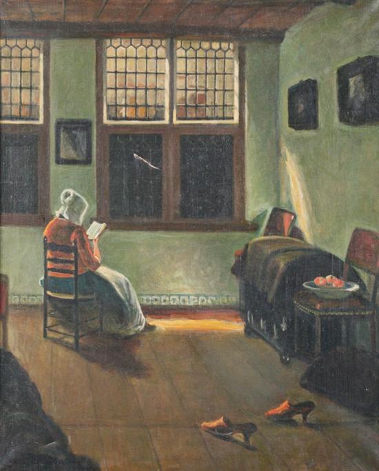 CONTINENTAL SCHOOL (20th Century). WOMAN READING BY WINDOW LIGHT, oil on canvas - Framed, 32 in. x 26 in. Estimate $300-400 tear through window