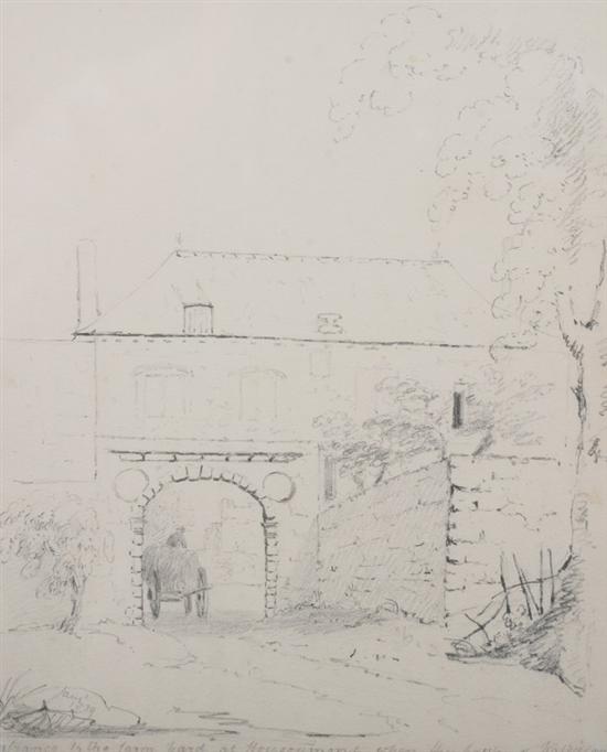 CONTINENTAL SCHOOL (20th century). ENTRANCE TO THE FARMYARD OF...WHERE THE BATTLE TOOK PLACE, signed indistinctly lower left, titled lower margin. Pencil on paper - Framed, sight: 8 1/4 in. x 6 3/4 in. Estimate $100-200