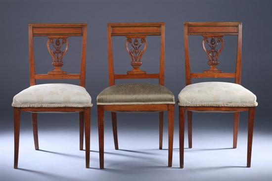 SET THREE CONTINENTAL FRUITWOOD SIDE CHAIRS, 19th century, with pale green stuffover seats, and gilt-metal mounts. Scrolling openwork vasiform splats; square tapering klismos legs - 34 in. x 19 in. x 16 in. Estimate $400-600