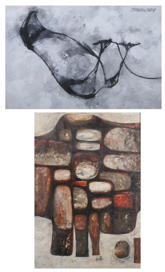 SOKOLSKY (American, 20th century). ABSTRACT IN BROWNS and BIRD: TWO WORKS, first, signed lower right. Oil on board. Second, signed upper right. Oil on paper - First, framed: 16 3/4 in. x 24 in.; Second, framed, sight: 9 in. x 13 3/4 in. Estimate $200-300