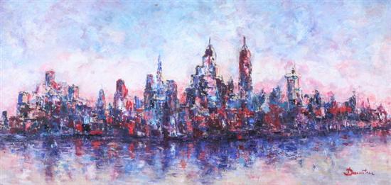 DUMITRU DANIELOPOL (American/Romanian, 1905-1982). CRIMSON CITY, signed lower right, also signed, dated 1970 and titled on reverse. Oil on canvas - Framed, 24 in. x 46 in.