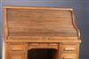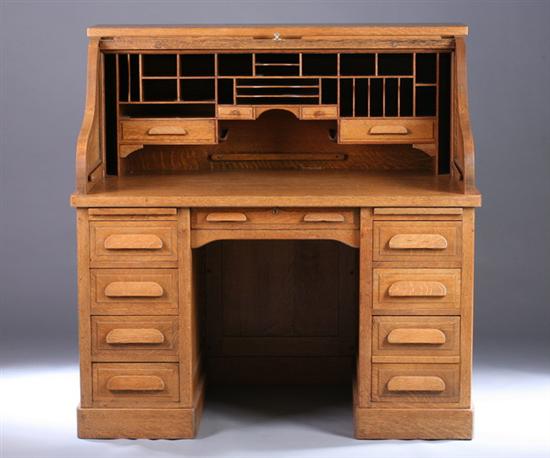MISSION STYLE ELMWOOD ROLL-TOP DESK. Early 20th century. Plinth top above down-swept recessed-panel sides; rolling tambour enclosure opening to fitted interior; frieze drawer flanked by drawered pedestals on plinth bases - 50 in. x 48 in. x 33 1/2 in.