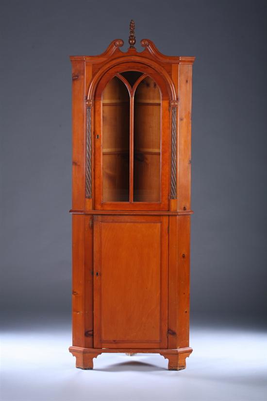 NEOCLASSICAL STYLE DIMINUTIVE PINE CORNER CABINET,early 20th century. Scrolling pediment top over arching gilded panel door; painted spiral-carved pilasters; recessed lower panel door opening to shelved storage; on bracket feet - 75 1/2 in. x 27 in. x 14 1/2 in. Estimate $300-500