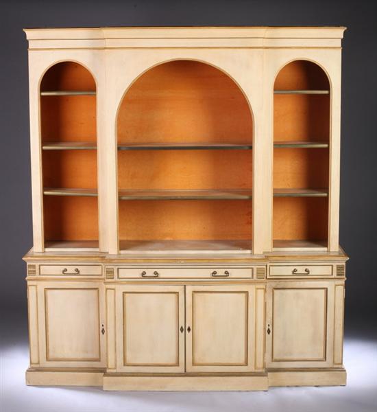 CONTINENTAL STYLE PAINTED BREAKFRONT CHINA/BOOKCASE CABINET.20th century, in two parts. Cove-molded crown above three-part arch-enclosed shelving, over conforming base with three aligned drawers and panel doors resting on plinth - 79 3/4 in. x 72 in. x 18 1/4 in. Estimate $300-500