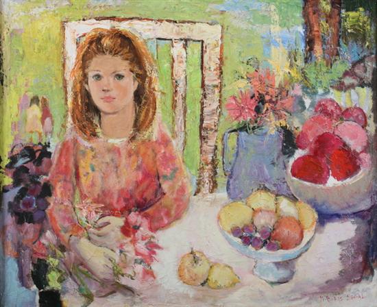 M. BOROS SEGAL. (American, 20th century). SEATED GIRL WITH FLOWERS AND FRUIT, signed lower right. Oil on canvas - Framed, 25 in. x 30 in. Estimate $200-300