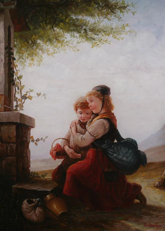 Sale 44 Lot 616 K. DOMINGO (Continental, 20th century). TWO CHILDREN KNEELING, signed lower right. Oil on panel - Framed, 15 3/4 in. x 11 3/4 in. Estimate $200-300 Unsold