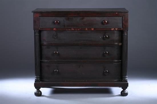 AMERICAN EMPIRE MAHOGANY CHEST OF DRAWERS,19th century. Plinth top over conforming frieze drawer; reeded columns; three bowed graduated drawers; plinth base on ball feet - 41 3/4 in. x 45 1/4 in .x 20 1/2 in. Estimate $300-400