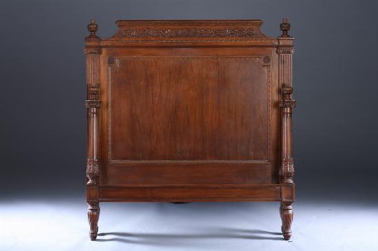 CONTINENTAL NEOCLASSICAL STYLE WALNUT BED FRAME,early 20th century, Wurdeman & Co. Interior Decorators, Conn. & Rhode Island Ave., Washington, DC. Finial-topped panel head board with fluted pilasters; and similarly topped fluted column foot board - 45 in. x 43 1/2 in. x 82 in. Estimate $300-500