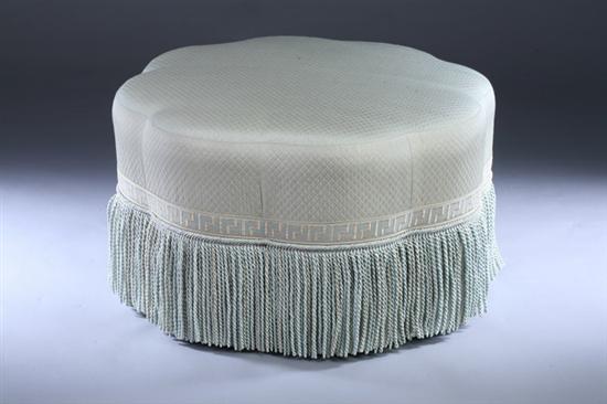 SCALLOPED-EDGE CIRCULAR POUF, Early 21st. century, O. Henry House, Ltd. Pale green micro-quilted upholstery; Greek Key banding; co-ordinated bouillon fringe - 17 3/4 in. x 30 1/2 in. Diam. Estimate $400-500
