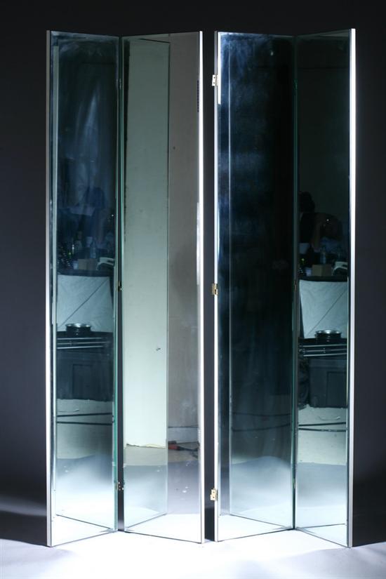 PAIR BI-FOLDING MIRRORED SCREENS, late 20th century, Interior Impressions, Inc. Each panel with bevelled-edge plate mounted on white Formica laminated panel - 85 in. x 33 in. x 1 in., each. Estimate $300-500