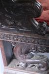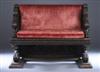 ITALIAN RENAISSANCE REVIVAL CARVED OAK UPHOLSTERED BENCH. Rectangular plank seat centered by elaborately carved floral and leaf supports with lion paw feet; carved legs with mask-form knees. Dark red velveteen upholstered back panel with matching tufted loose seat cushion - 38 3/4 in. x 48 1/2 in. x 18 1/2 in.