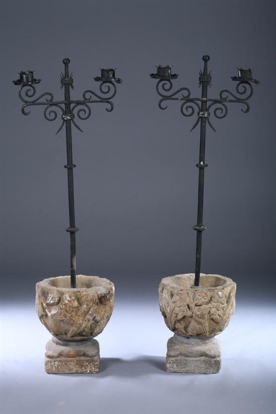 PAIR ASSEMBLED CAST STONE AND WROUGHT-IRON TWO-LIGHT CANDELABRA,20th century. Urn-form bases cast with figural scenes, supporting black wrought-iron stand with two lights - 50 in. high.
