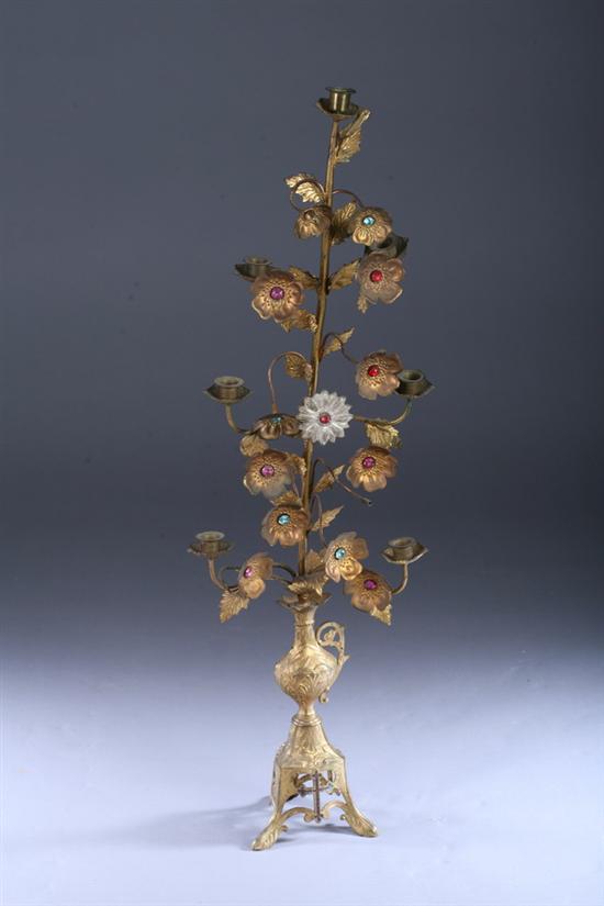 CONTINENTAL GILT-METAL SEVEN-LIGHT CANDELABRUM,late 19th century. "Gem" encrusted flowerheads and leafy branches, issuing from a triangular base - 38 1/2 in. high.