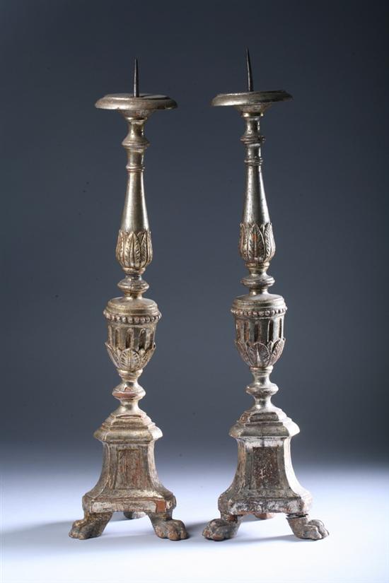 PAIR ITALIAN NEO-CLASSICAL STYLE CARVED GILT WOOD PRICKET CANDLESTICKS,18th - 19th century. Tripartite base, raised on paw feet, baluster-form standard - 25 in. high.