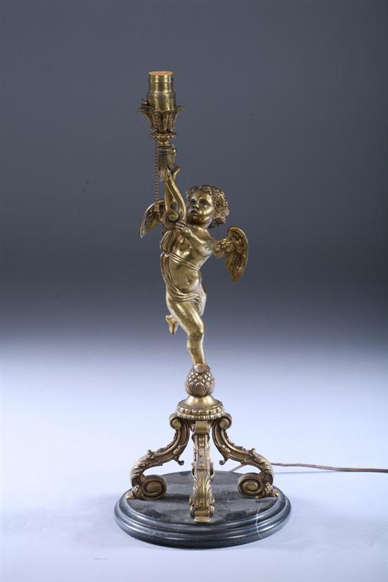 CONTINENTAL GILT-BRONZE FIGURAL CANDLESTICK,19th century. Quadripartite base of acanthus-capped scrolls, supporting putto standard, holding a scroll with urn-form nozzle; mounted on circular black marble base. Electrified - 24 1/2 in. high, overall.