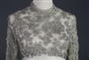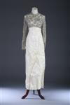 CUSTOM-MADE SILVER BEADED AND WHITE SATIN EVENING GOWN.Circa 1960. White lace empire bodice lavishly decorated allover with silver glass beads and rhinestones, on a simple white satin a-line skirt. Bodice in fragile condition