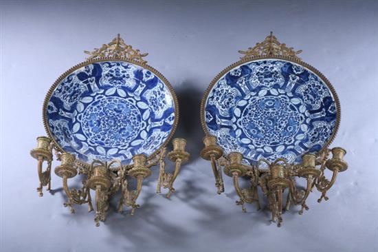 Sale 44 Lot 1081 PAIR GILT-BRONZE MOUNTED DUTCH DELFT FIVE-LIGHT SCONCES. 19th - 20th century. Dutch Delft chargers; later gilt-bronze mounts, issuing five scrolling arms, urn-form nozzles - 25 1/4 in. high x 14 in. diam. PROVENANCE: Estate of Psychic Jeane Dixon, Washington, DC Estimate $400-600 PROVENANCE: Estate of psychic Jeane Dixon, Washington, DC Charges with chips and fleabites along the rims. No cracks, crazing or repairs Sold for $1,900