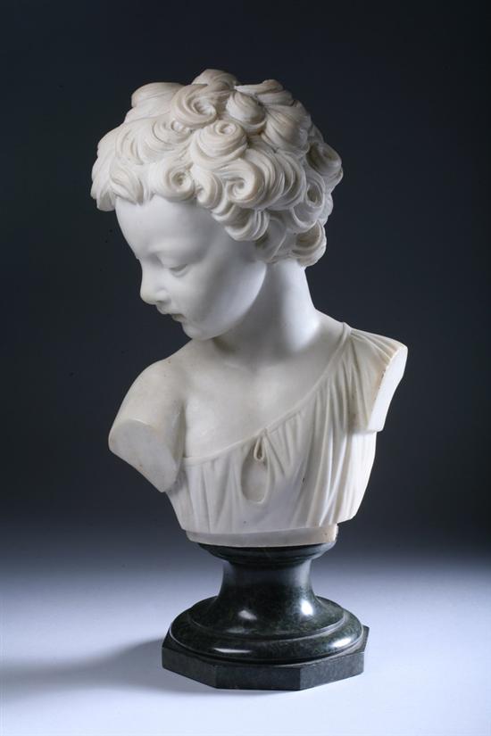 FERDINANDO VICHI (Italian, 1875-1945). Amore, Carved white marble, on a green marble socle. The reverse inscribed "Amore F. Vichi Firenze" - 20 in. high
