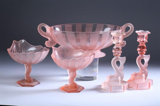FIVE-PIECE ART DECO PINK GLASS TABLE SERVICE.Circa 1930s. Comprising a centerbowl, two compotes and a pair candlesticks; all in a Dolphin motif - 9 1/4 in. high, candlesticks.