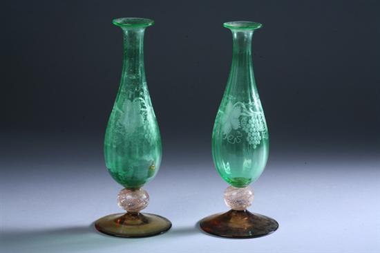 Sale 44 Lot 1055 PAIR MURANO GREEN GLASS BUD VASES. mid-20th century. Circular foot, knopped stem, supporting green glass vase with frosted grapevine decoration - 9 1/4 in. high. PROVENANCE: Estate of Psychic Jeane Dixon, Washington, DC Estimate $250-350 PROVENANCE: Estate of psychic Jeane Dixon, Washington, DC Excellent condition - no chips or repairs Unsold