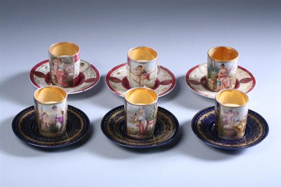 SIX ROYAL VIENNA DEMITASSE CUPS AND SAUCERS.early 20th century. Three, with cobalt and gilt decoration; three, with magenta and gilt decoration. Each with hand-painted scene of Classical beauty, signed - 2 in. high, cup.