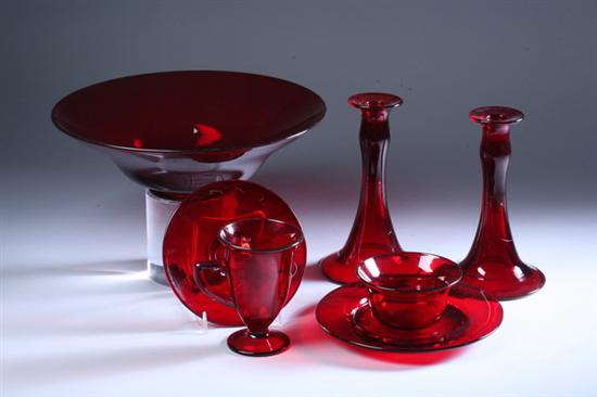 Sale 44 Lot 1062 43-PIECE ASSEMBLED RUBY GLASS SERVICE, 20th century. Including nine luncheon size plates, twelve dessert plates, ten dessert bowls, eight handled glasses, three candlesticks, salad bowl - 8 in. diam., luncheon plates. PROVENANCE: Estate of Psychic Jeane Dixon, Washington, DC Estimate $200-300 PROVENANCE: Estate of psychic Jeane Dixon, Washington, DC