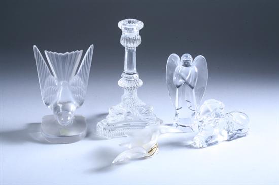 FIVE CRYSTAL TABLE ARTICLES. Including a Lalique "Hirondelle" paper weight, Baccarat angel, Baccarat unicorn, Tiffany & Co. candlestick and Lalique Nina Ricci perfume topper of two birds. - 8 1/4 in. high, largest.