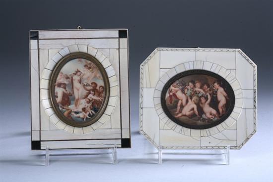 TWO FRENCH PAINTED MINIATURES.19th century. One, of the Birth of Venus, signed; one, of playful children. Gouache on ivory. Framed - 3 1/4 in. x 1 1/2 in.
