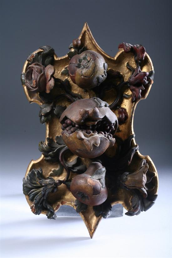 ITALIAN CARVED AND PAINTED GILT WOOD PLAQUE OF POMEGRANATES.early 20th century. Shield-form plaque heavily encrusted with trailing fruited pomegranate vines - 15 in. x 9 1/4 in.