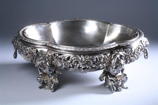 IMPRESSIVE VICTORIAN SILVER PLATED CENTERBOWL.late 19th century. Shaped oval, pierced border; raised on four figural mounts cast as partially clad males; the whole decorated with scrolling foliage; lion's masque ring pull handles; conforming liner - 7 in. x 21 1/2 in.