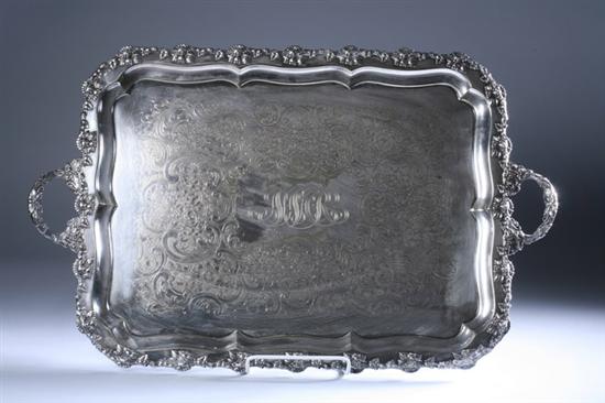 ENGLISH SILVER PLATED SERVING TRAY.early 20th century, Ellis-Barker for Bailey Banks and Biddle. Rectangular, the surface ornately engraved with scrolls and flowers, centered with monogram; cast and applied grapevine border, handles - 30 in. total length.