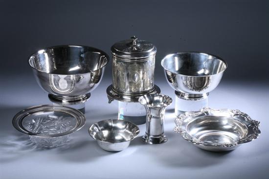 Sale 44 Lot 1021 SEVEN PIECES STERLING AND SILVER PLATED HOLLOWWARE. Including a Webster vase with ruffled rim; Otto Reichardt small dish with flaring rim; Watson sterling-mounted crystal bowl; Gorham bowl with scrolling and flaring rim, pattern 745, 1970s; two silver plated Revere-style bowls; Victorian silver plated biscuit barrel - 19 oz., 8 dwt., weighable silver; 10 1/2 in. diam., Gorham bowl. PROVENANCE: Estate of Psychic Jeane Dixon, Washington, DC Estimate $300-400 PROVENANCE: Estate of psychic Jeane Dixon, Washington, DC